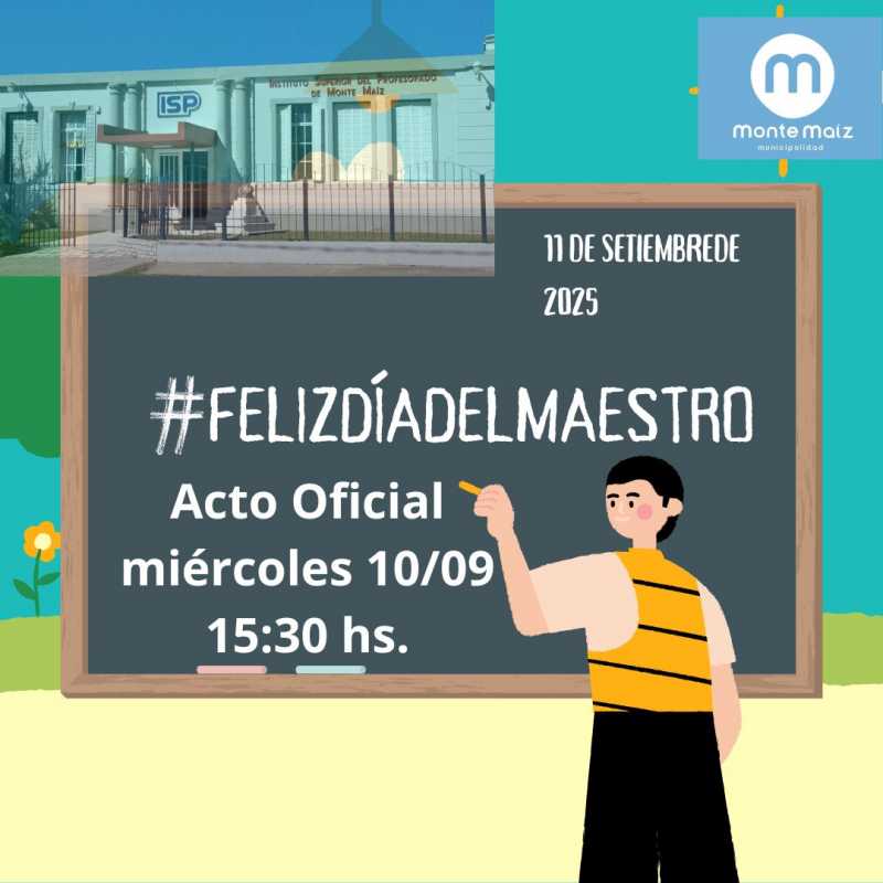 La Municipalidad de Monte Maíz invita a la comunidad al acto de conmemoración por el Día del Maestro, que se llevará a cabo el miércoles 10 de septiembre a las 15:30 en las instalaciones del Instituto Superior Profesorado.