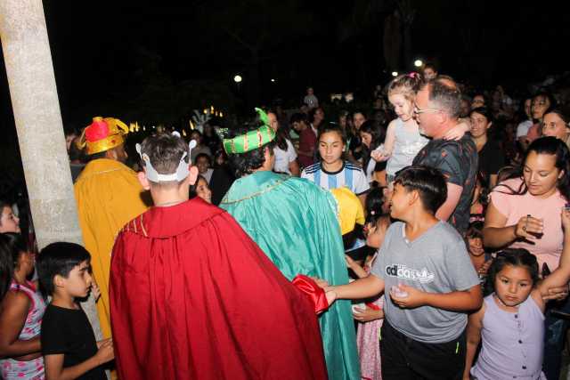 Los Reyes Magos estuvieron en la plaza San Martín de Monte Maíz en la noche del jueves 5 de enero de 2023, regalando golosinas a los niños del pueblo.